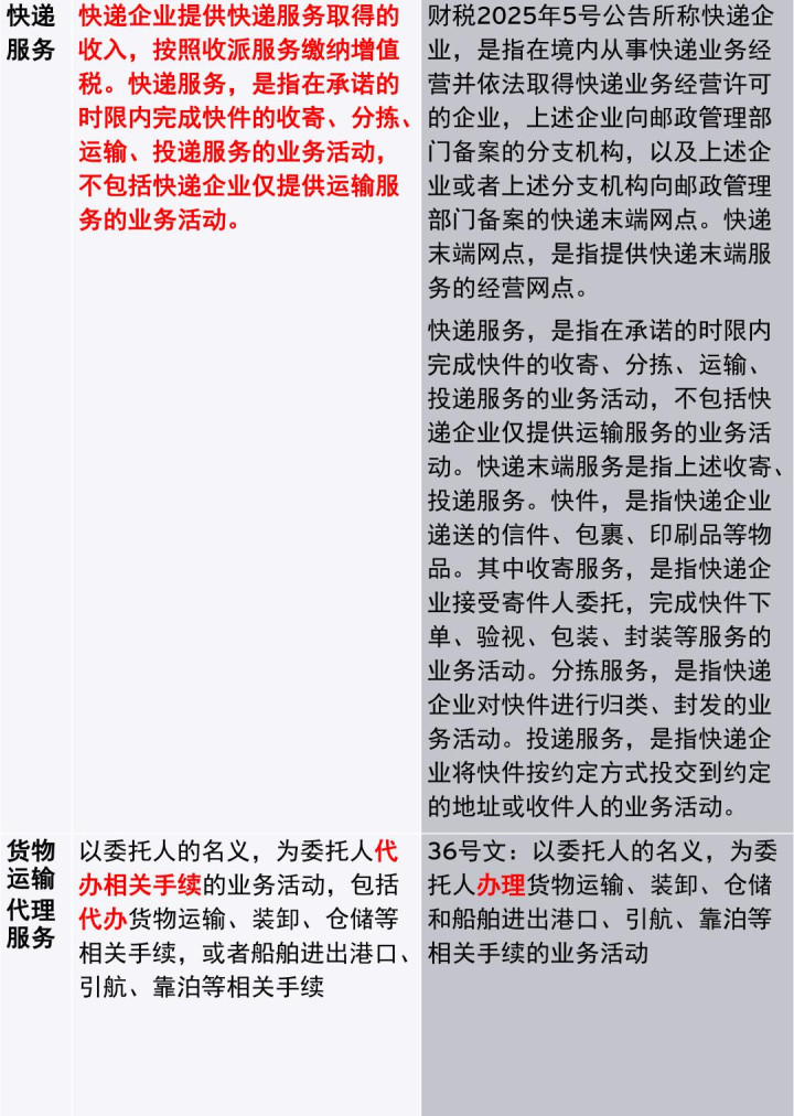 快递相关业务定义延续财政部 税务总局公告2025年第5号《关于明确快递服务等增值税政策的公告》(以下简称“财税2025年5号公告”)中定义,但具体条件略有差异。
